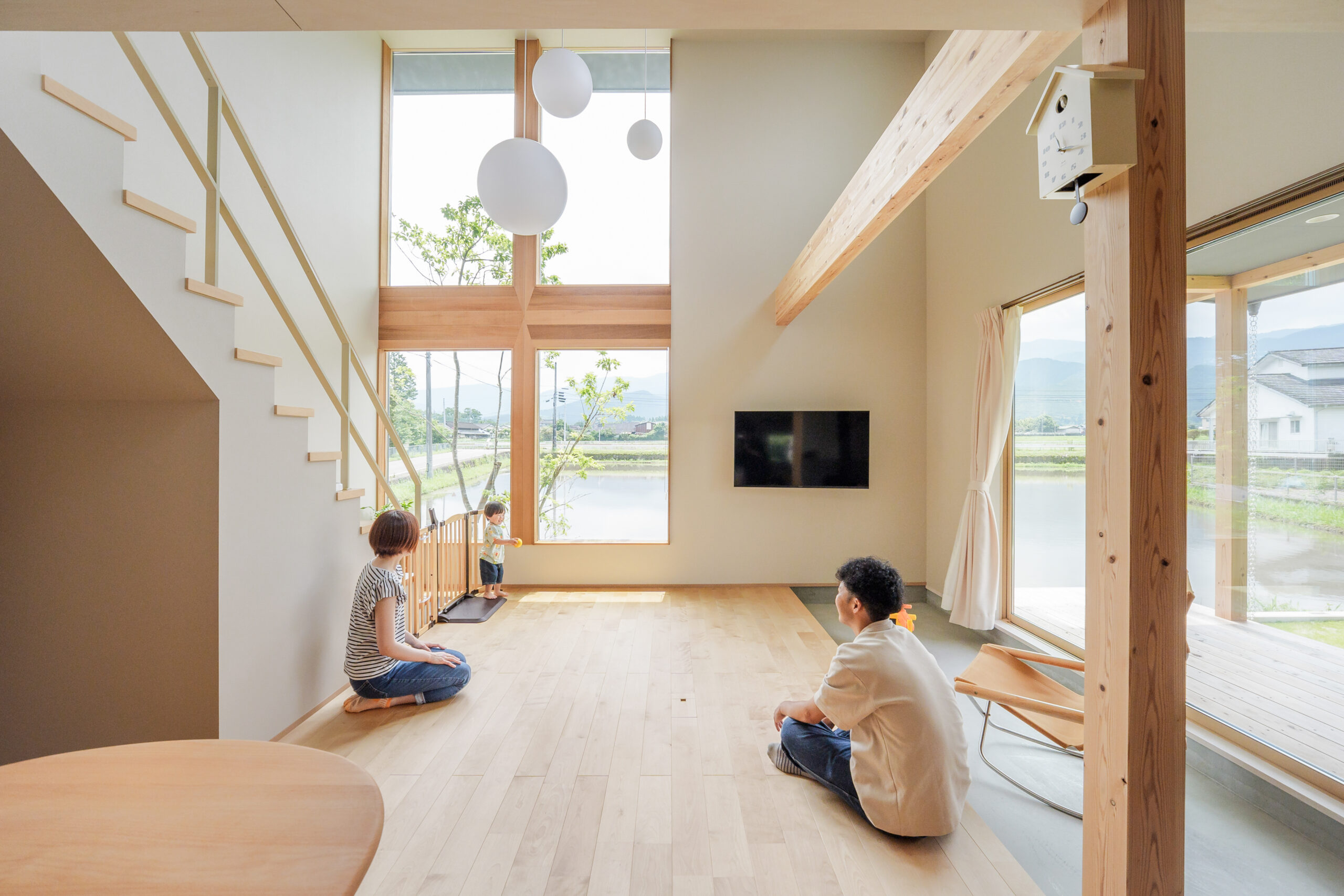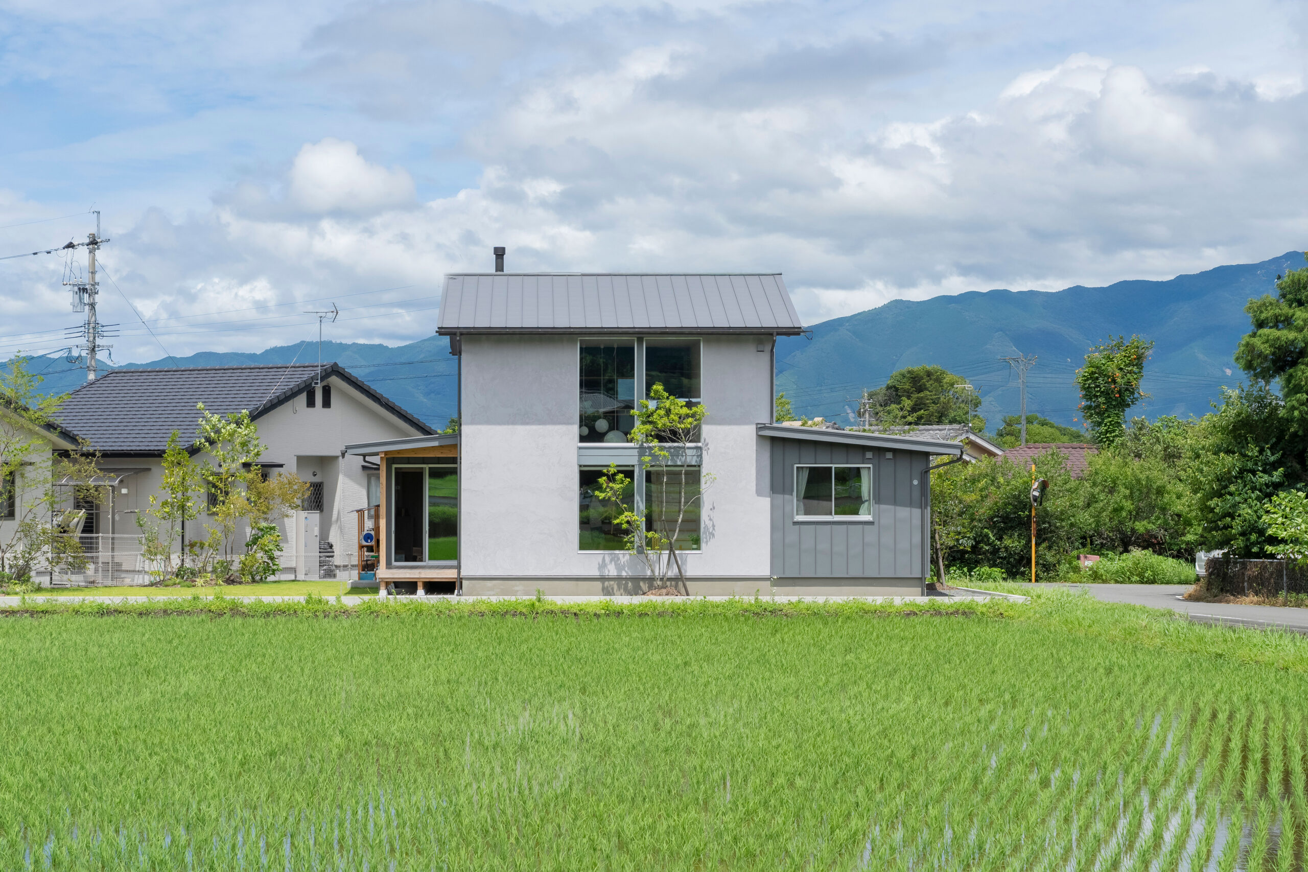 目の前が田んぼの開けた土地に佇む、十字窓のあるお家。