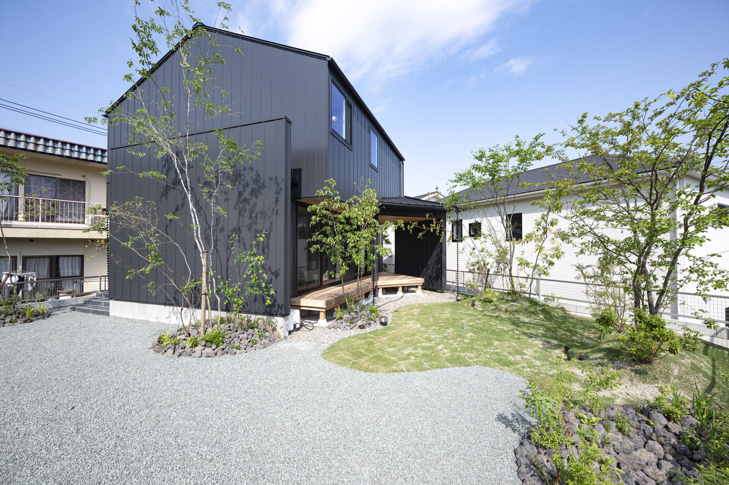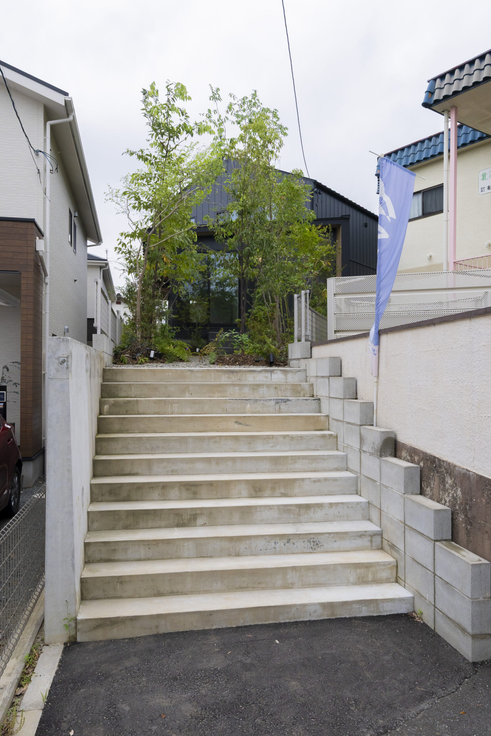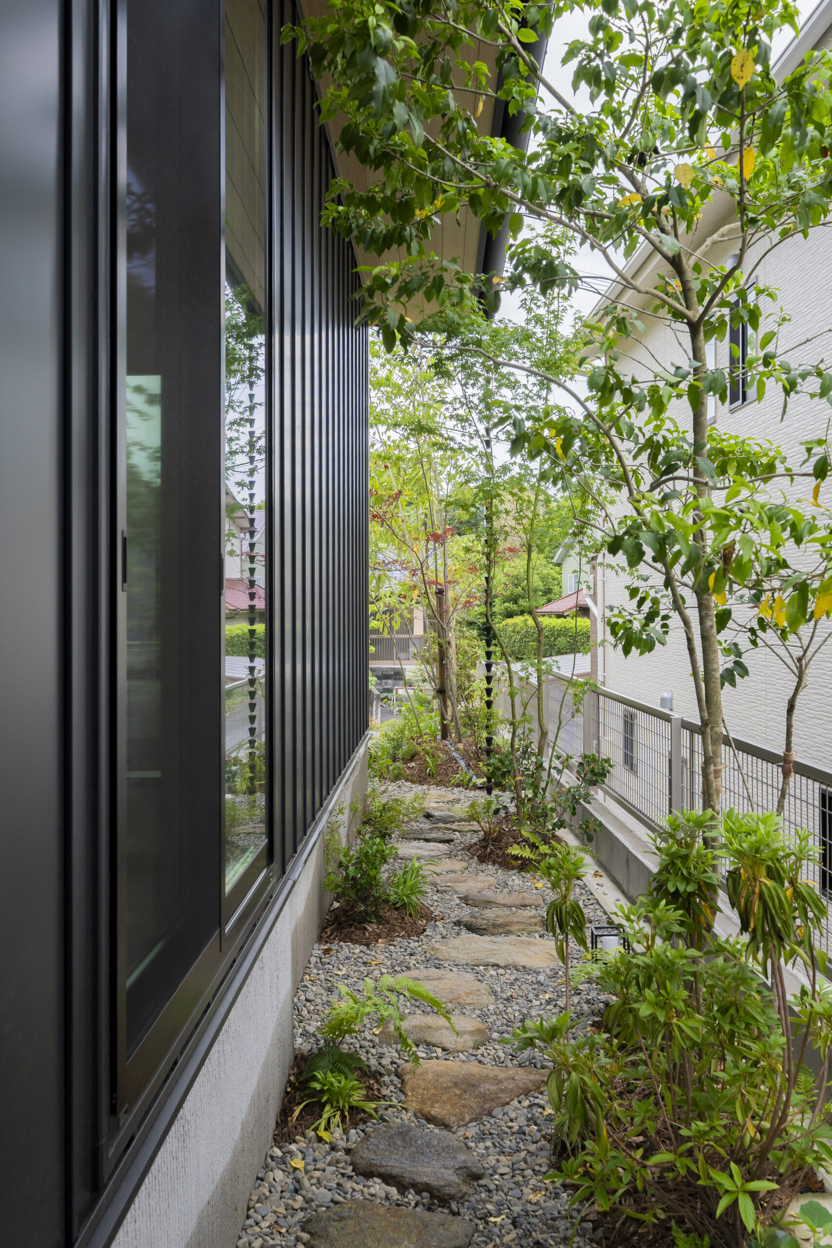 二つの庭を往来する途中にも外構をしっかりと計画することで、途切れない連続性を持たせてます。