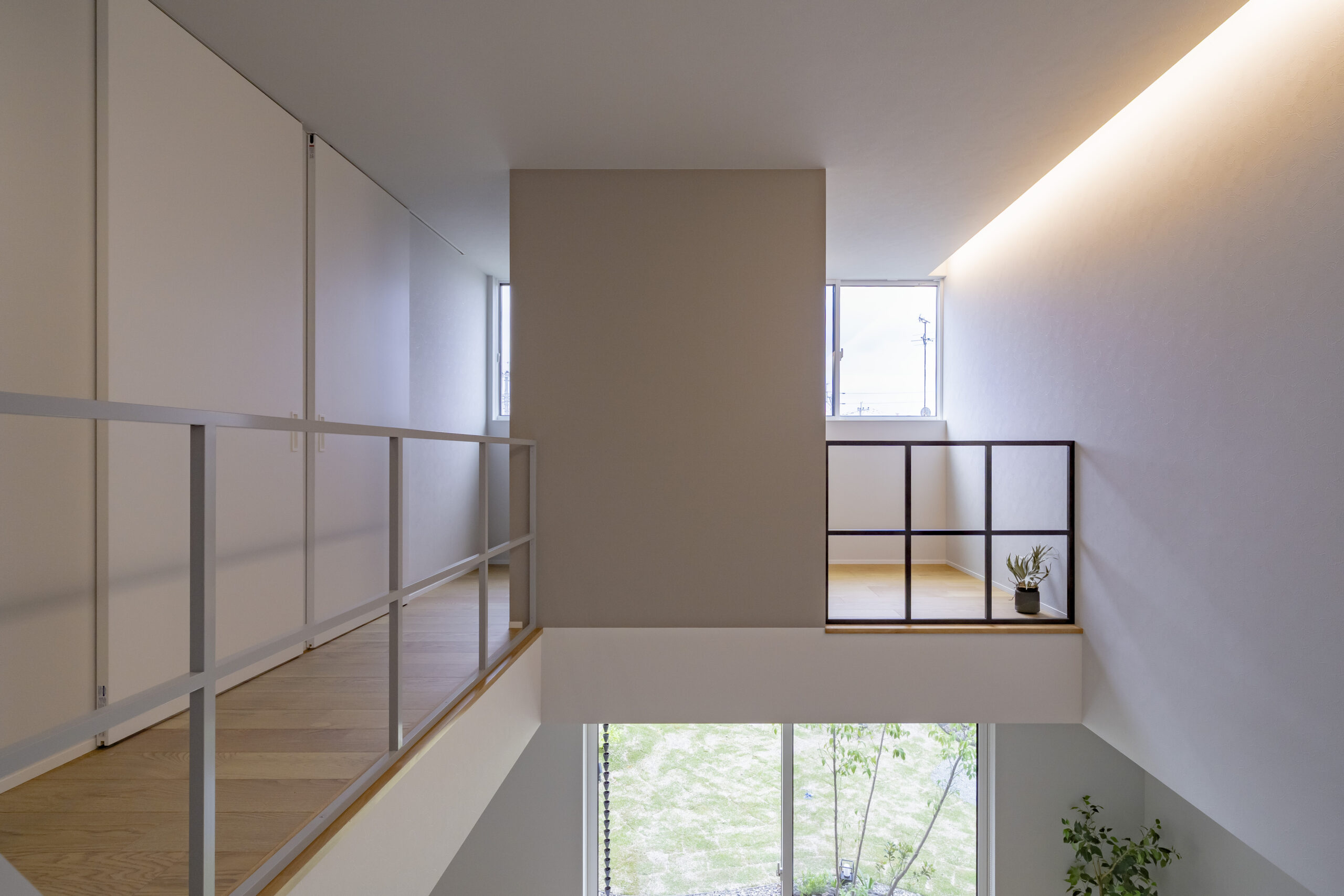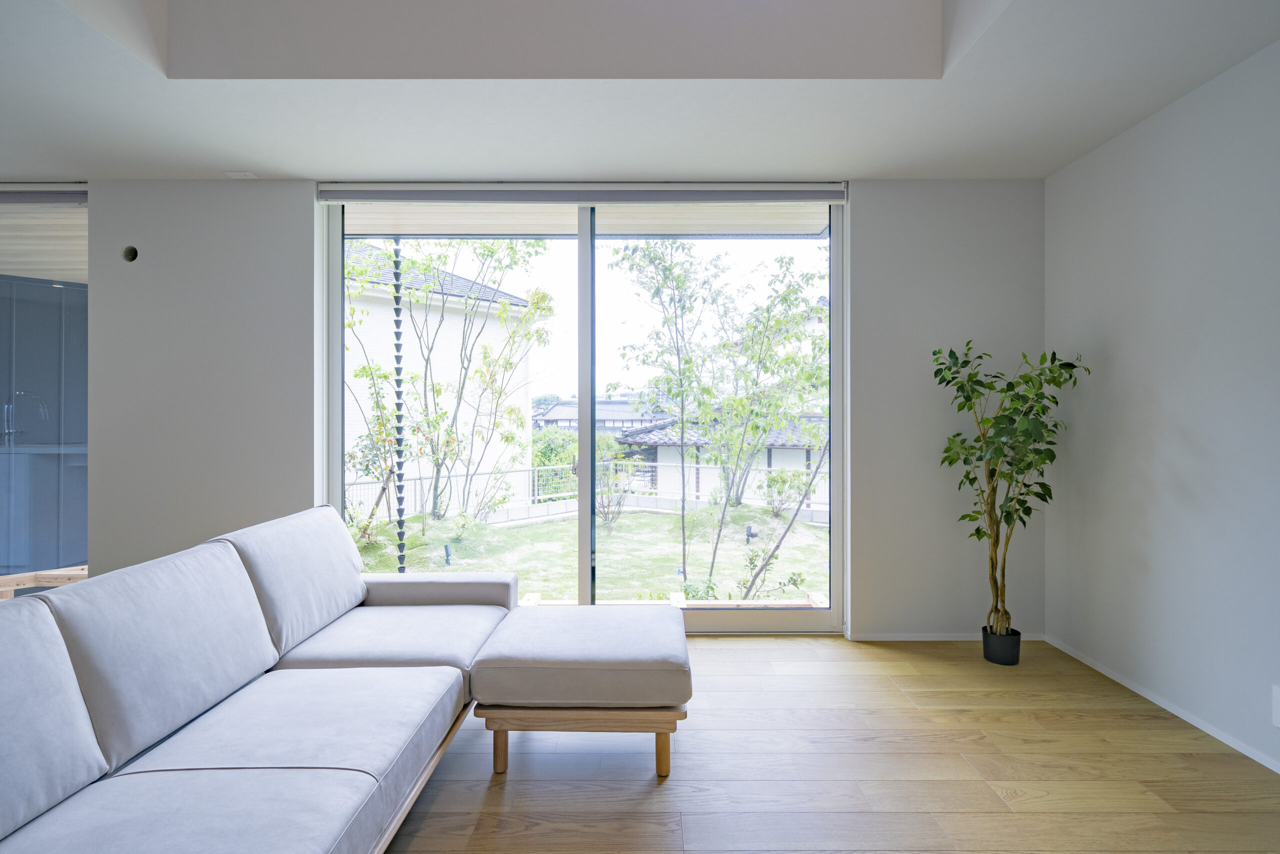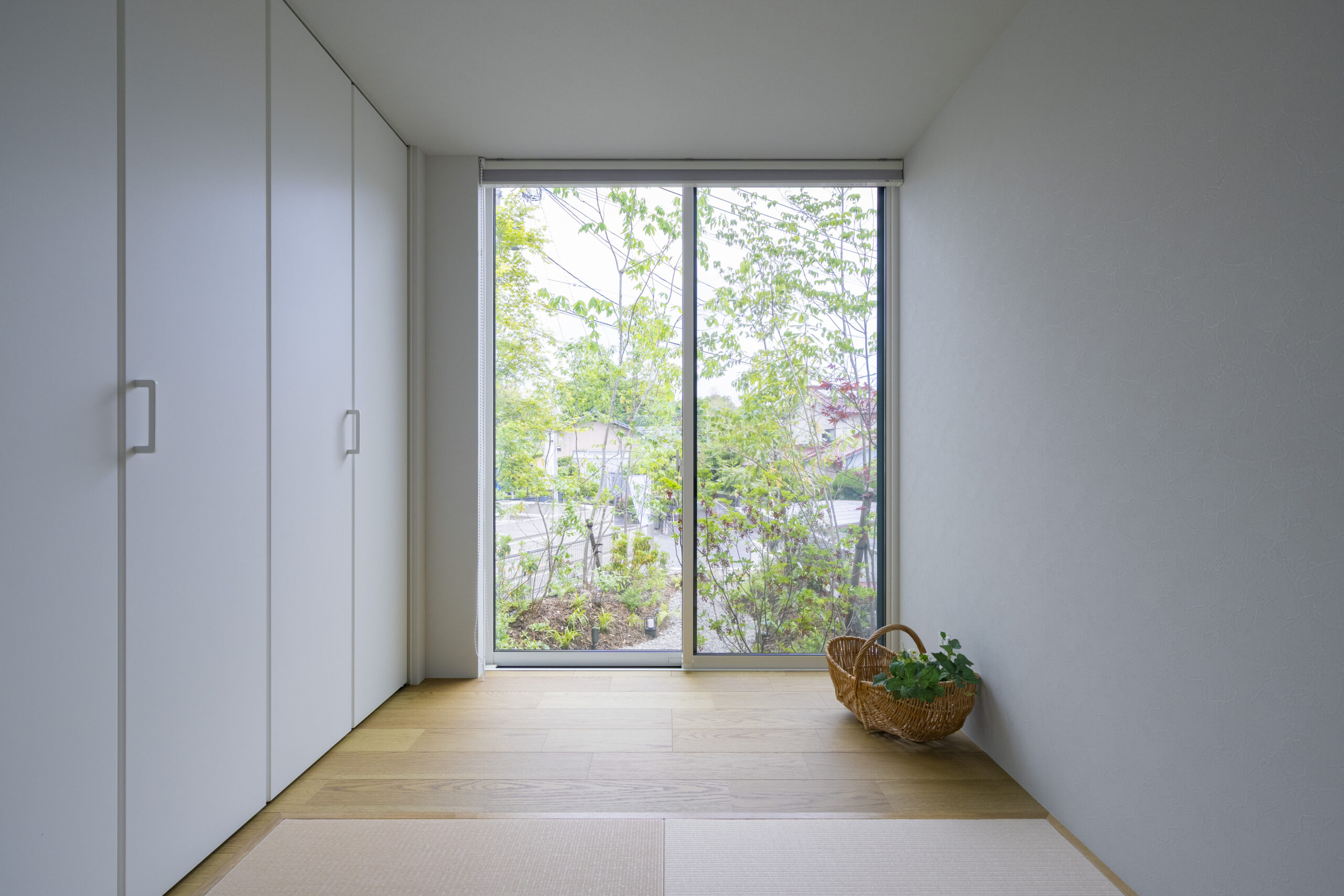 建物内部からの見え方としても、南東に窓を設けて植栽を見せることで二つの庭が完全に切り離されている印象を多少軽減してます。