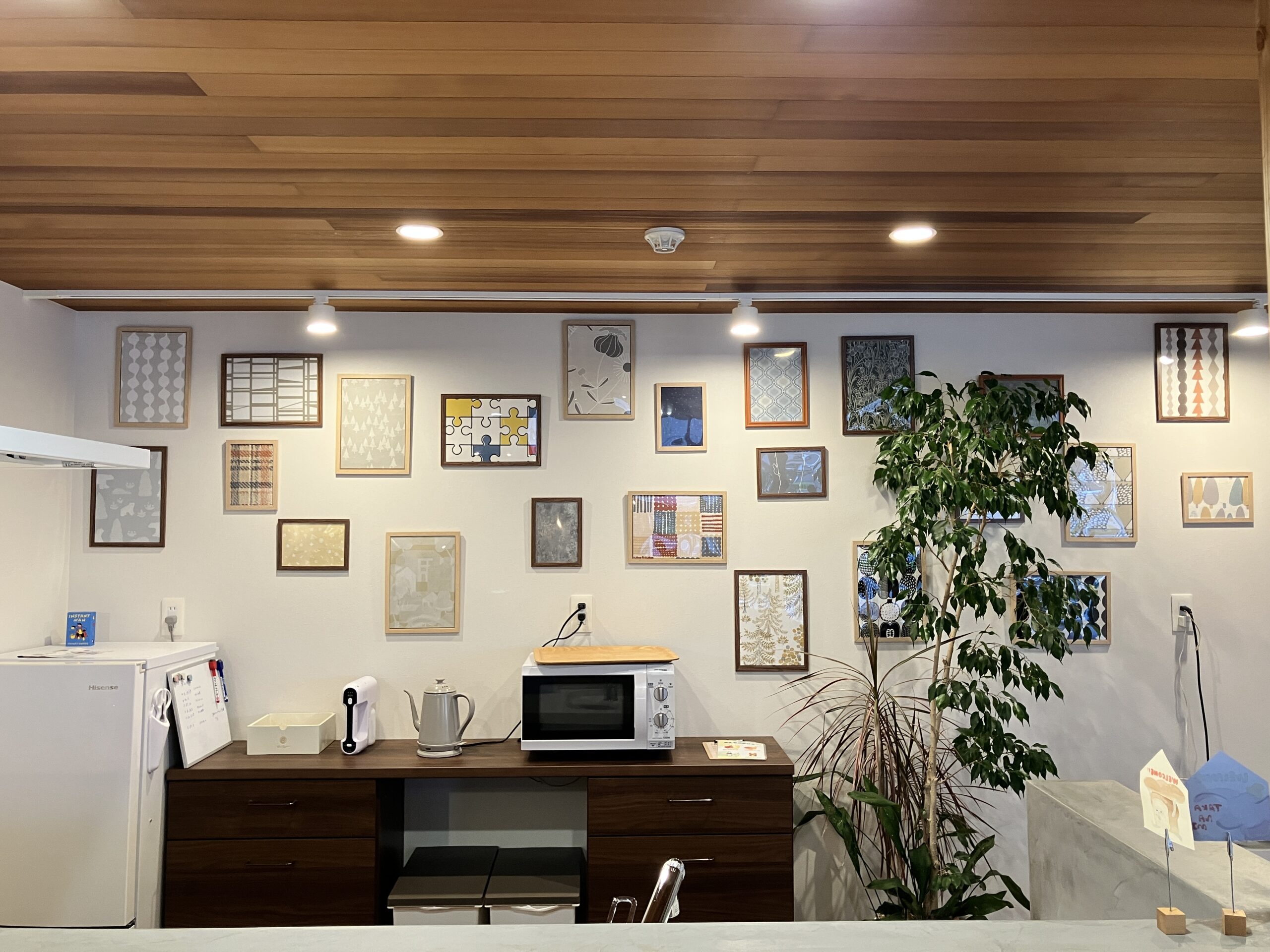 そしてこちらは打合せで使用するクロスサンプルをただ額縁に入れただけの即席の展示スペース。