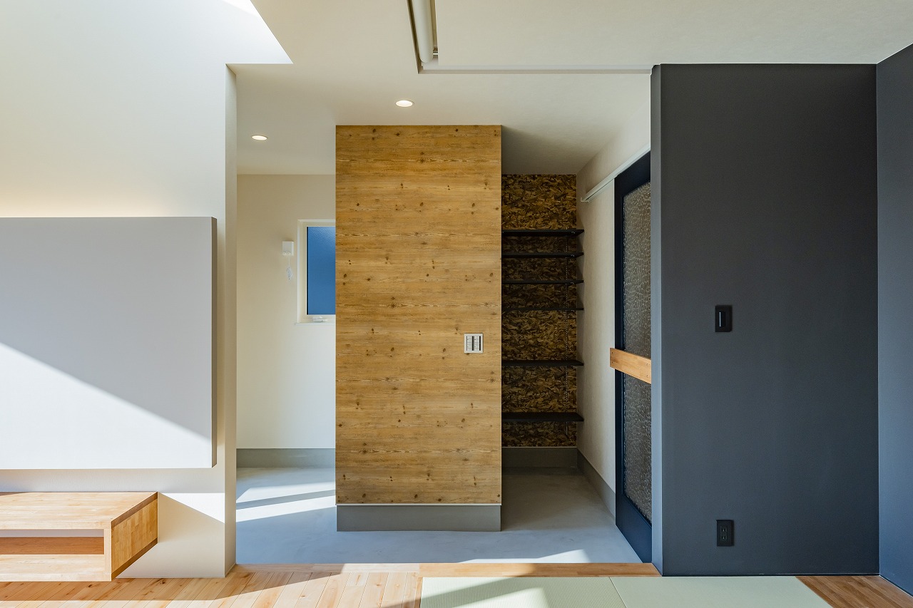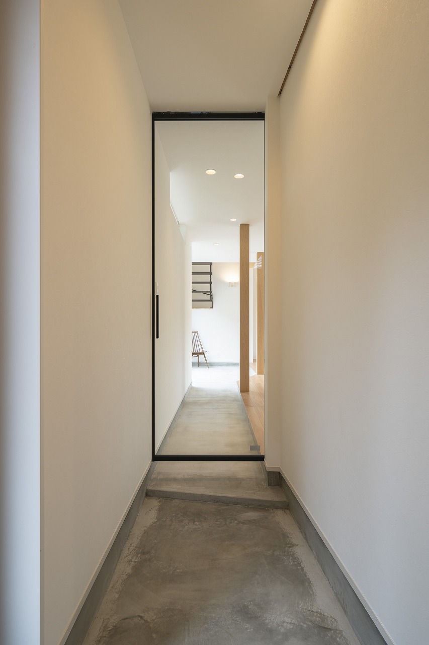 左を向くとこんな感じ。引き戸は枠が薄く全面ガラス張り。きゅっと狭くなった通路があってその先に明るい広い空間が見えるので初めて来る人でも「こっちがリビングか」って分かりますね。それで土間をよく見てください。段差がありますね。これが土足と素足の境目です。汚れる心配も減って気持ちよく使えますね。私だったら土間にアンティークのネイティブラグを敷いて好きなビンテージ達のお手入れをします。