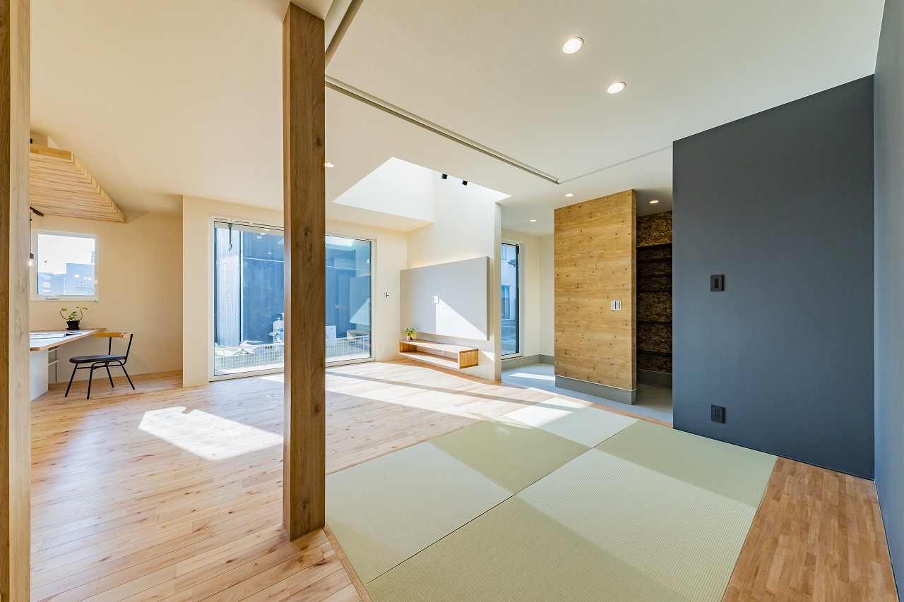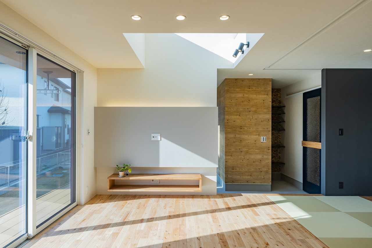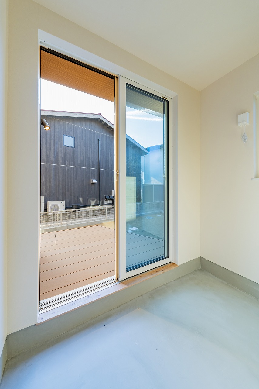 リビングからみるとこんな感じです。このお家のご主人様は社会人野球をされてる方なので床に腰掛けてグローブやスパイクのお手入れをしたり。