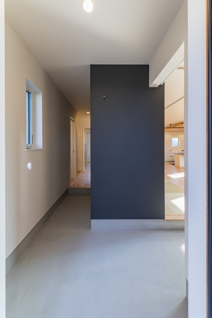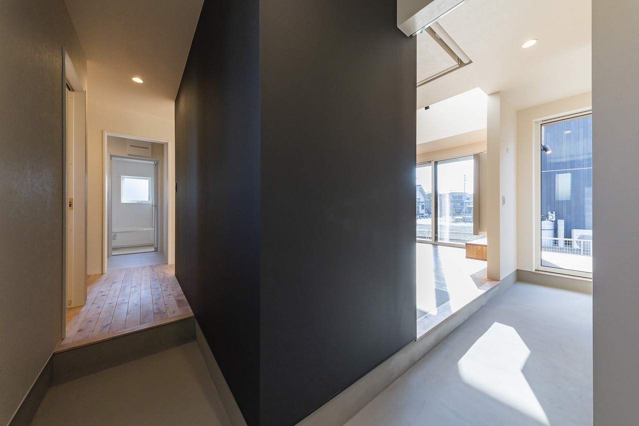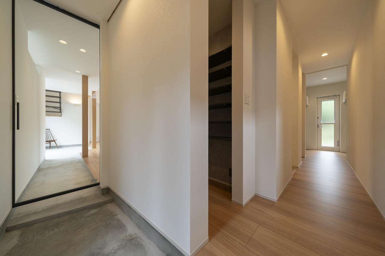 まずは玄関オープンするとまっすぐルートには生活導線を集めてます。LDKへは左へ。