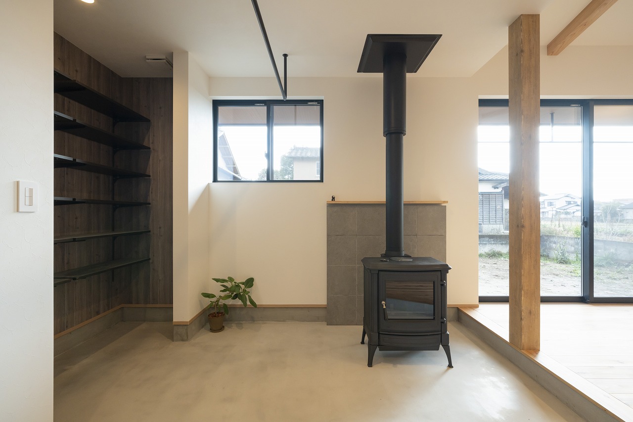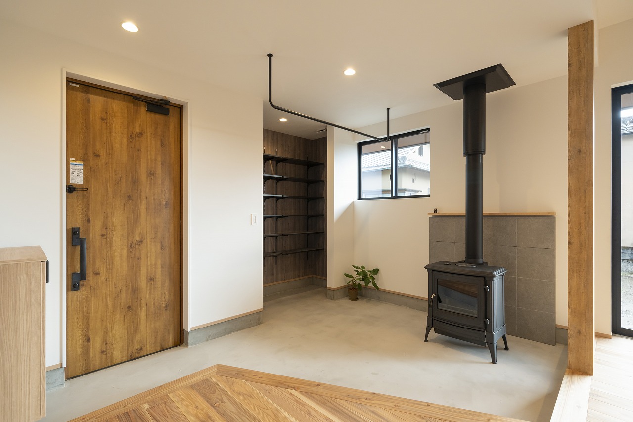 左に目を向けると薪ストーブとキャンプ等のギアをしまう空間が