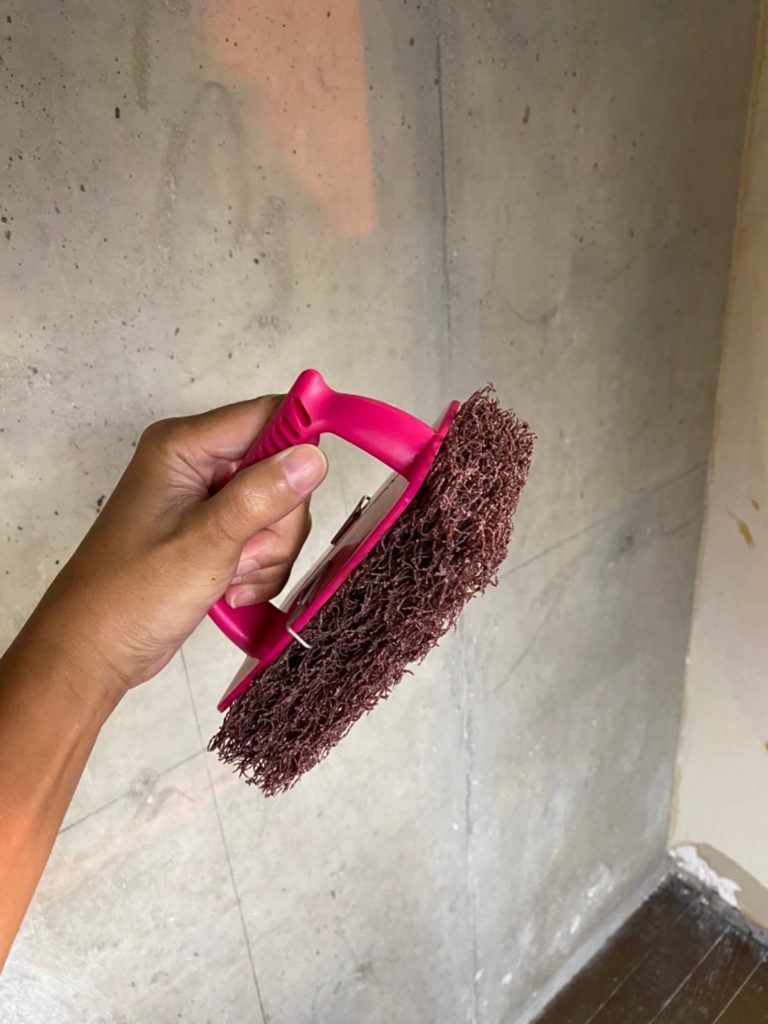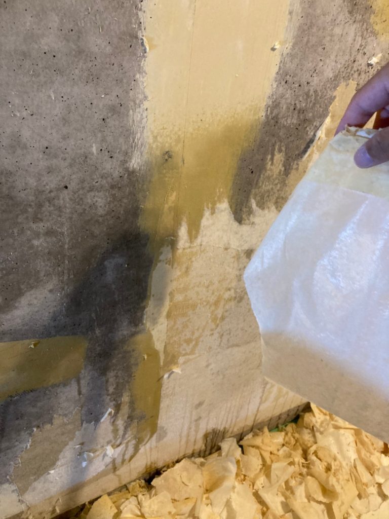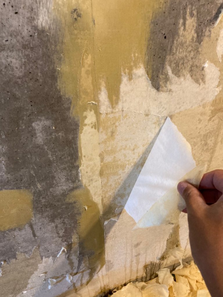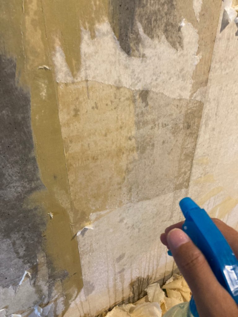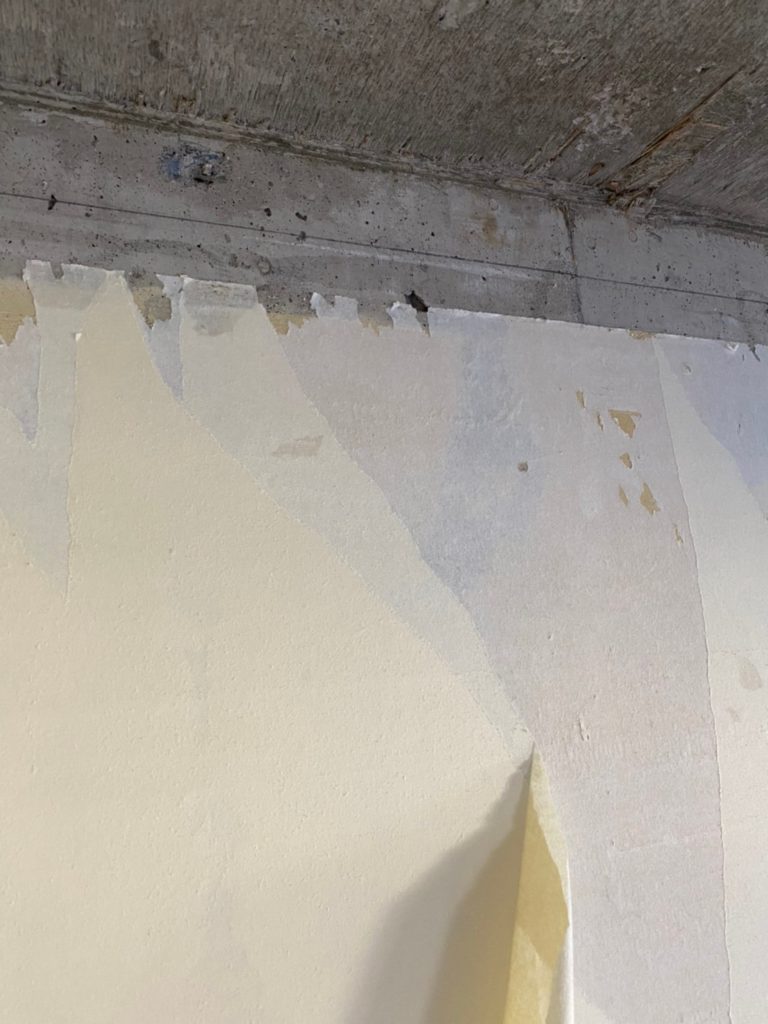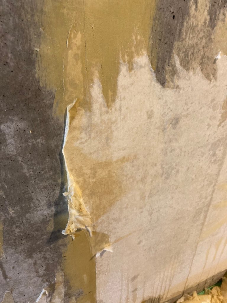 前回はコンクリ壁に貼ってあるクロスの上紙を取ったという所でした!