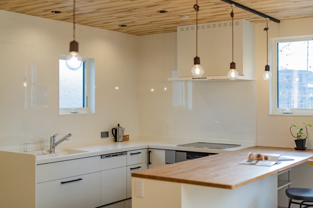 「造作で作ったダイニングカウンター」と「L型のキッチン」を組み合わせて「コの字型」にしたキッチンや