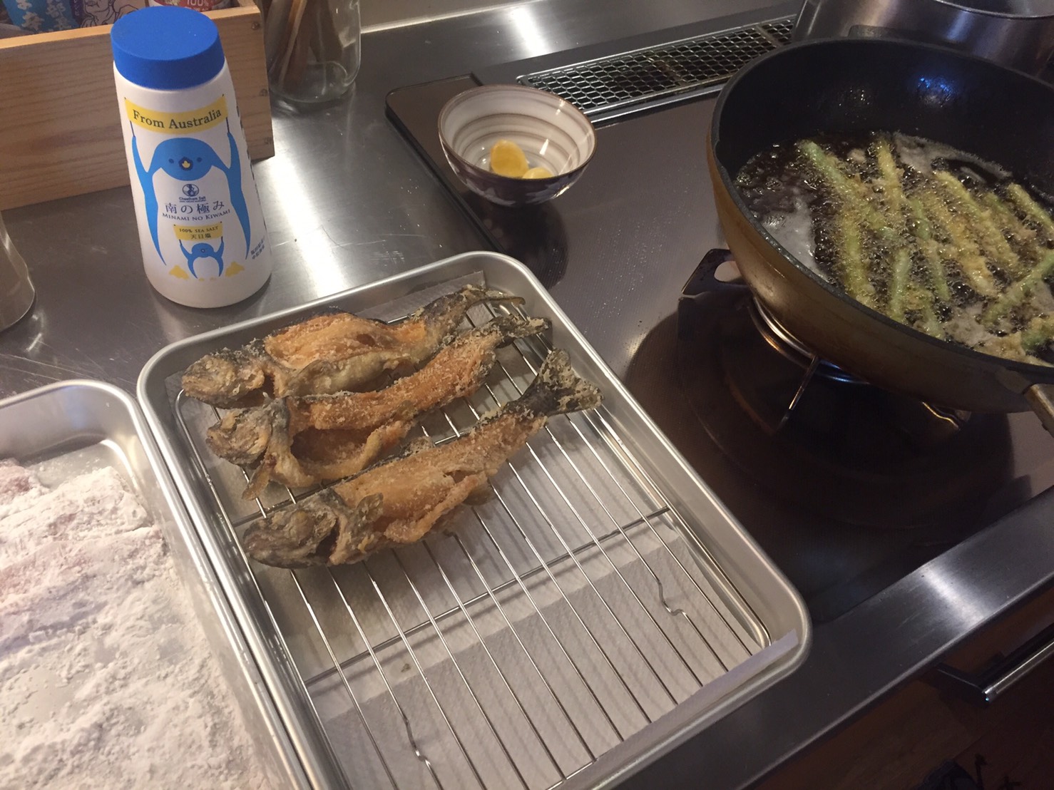 三枚におろして身は天ぷら、骨はカリカリに揚げて頭から丸ごとパクリ。