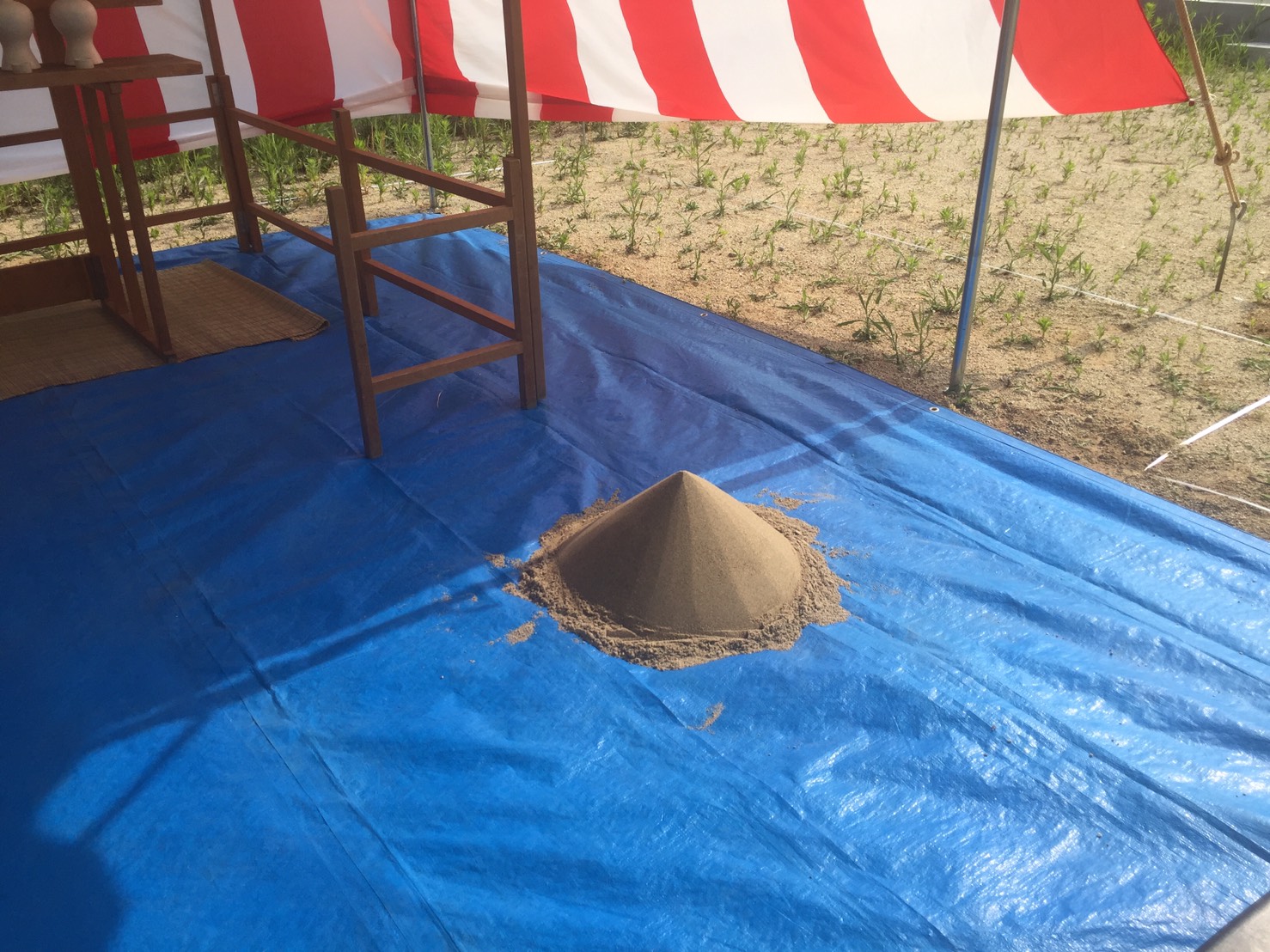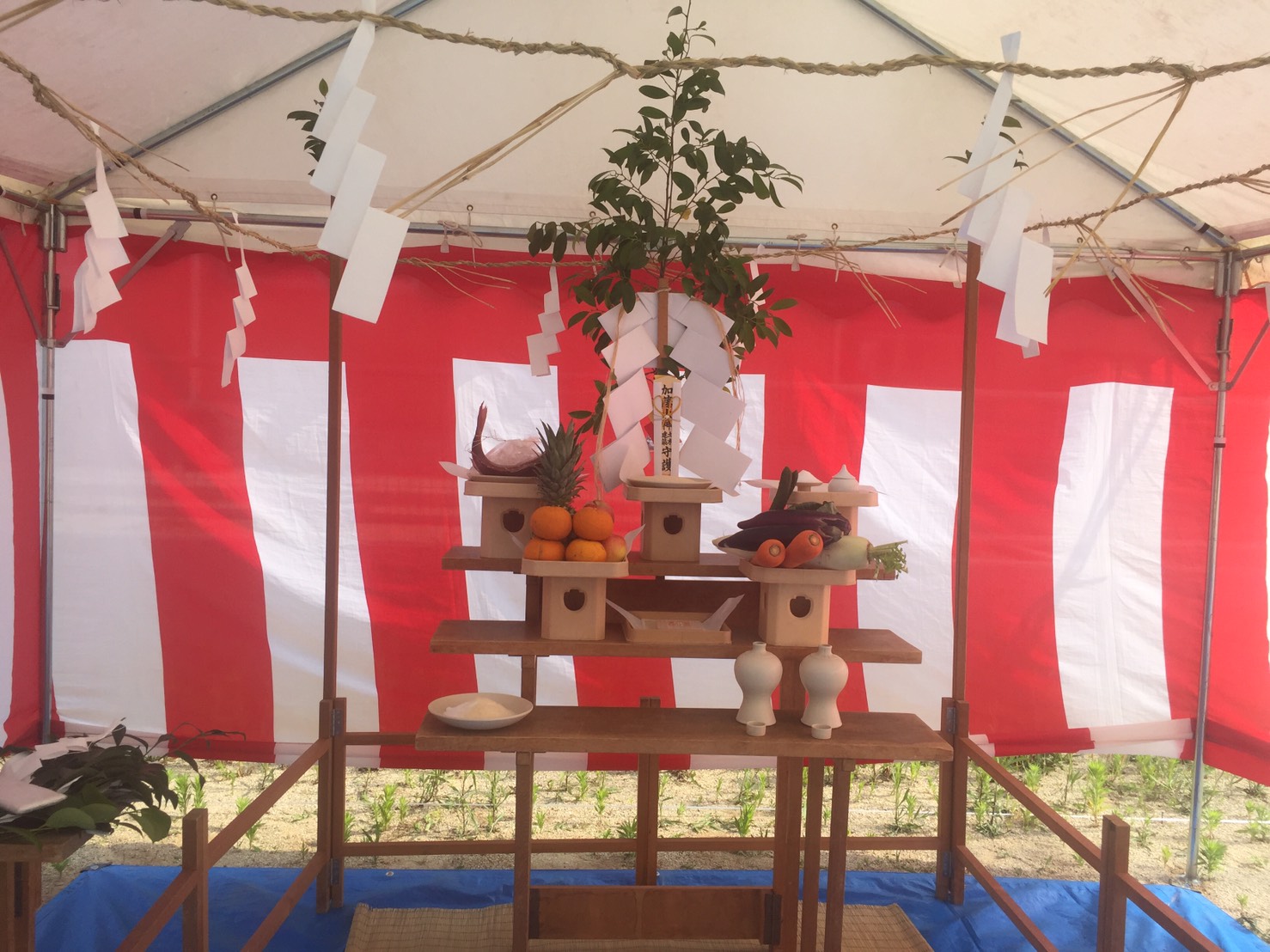 建築工事をはじめるにあたり、その土地の神様を祀り、工事の無事進行、完了と土地・建物が末長く安全堅固であることを