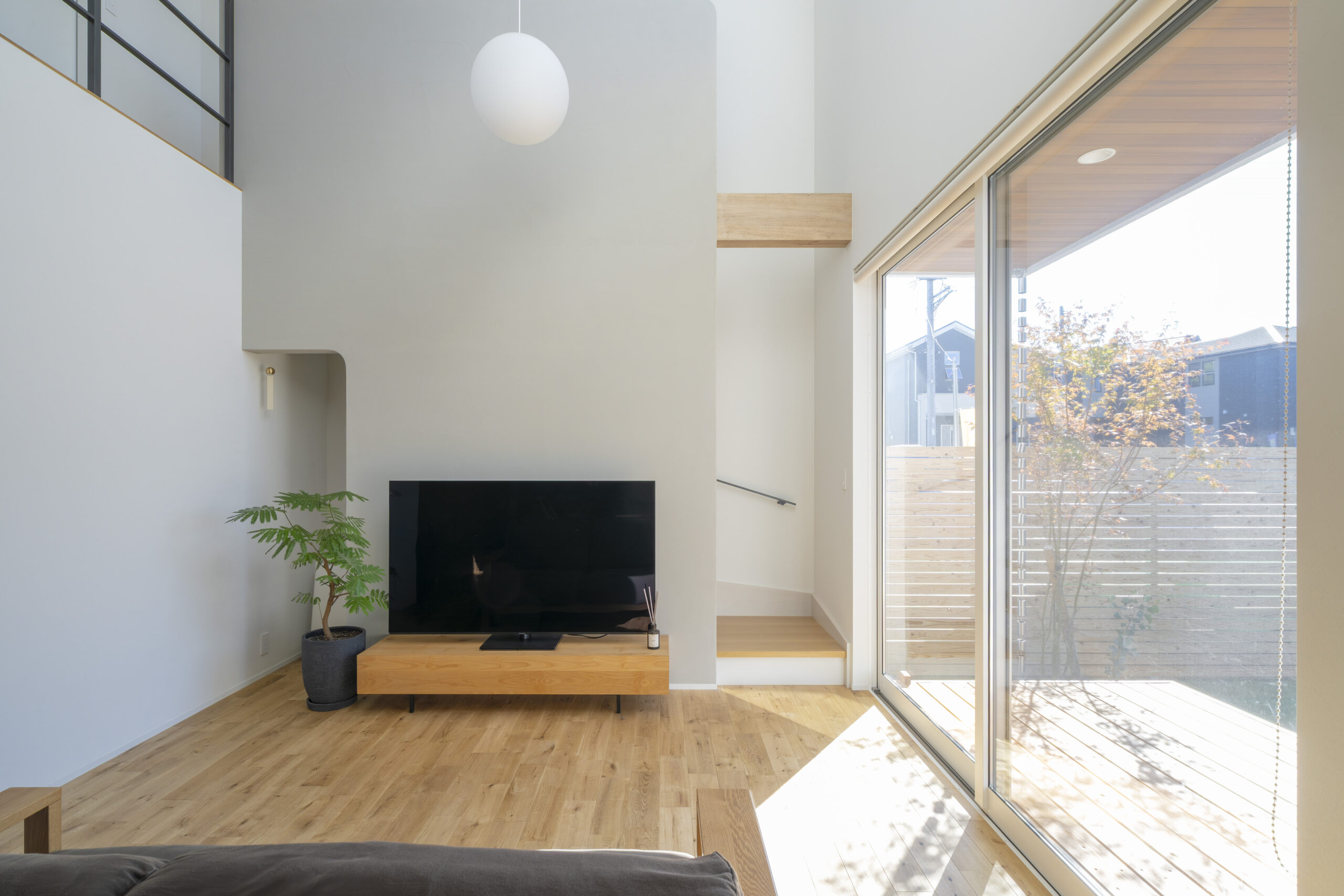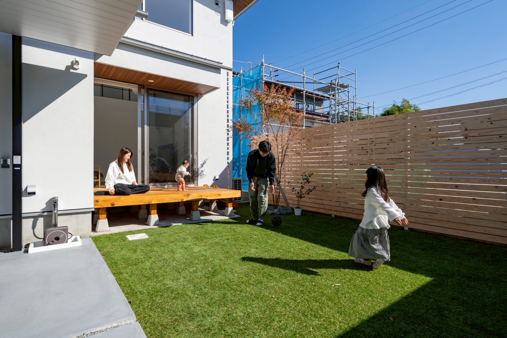 塗り壁Stoに木目の軒天が映える洗練された外観。視線の気にならないプライベートな庭も確保。