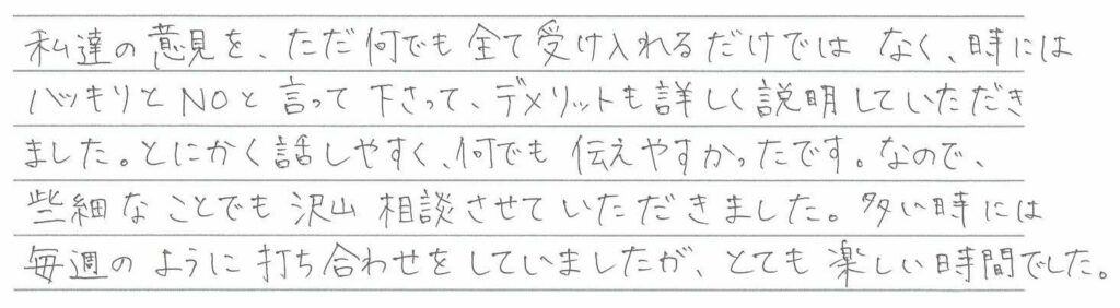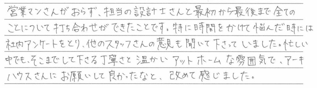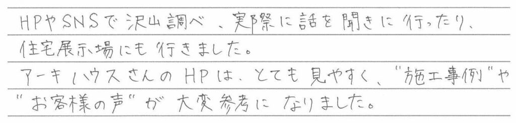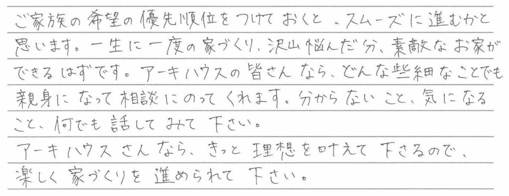 アフターメンテナンスの充実さは大きなポイントでした。 熊本県宇土市 / S様 Q どのようにして住宅メーカーや、設計事務所を探されましたか? A Q 家づくりでどういうことを重視されましたか? A Q アーキハウスで家を建ててよかったと思うことはなんですか? A Q 家づくりを進めていくなかで、思い出に残ったことは何ですか? A Q これから家づくりを始められる方に一言アドバイスをお願いします。 A