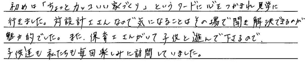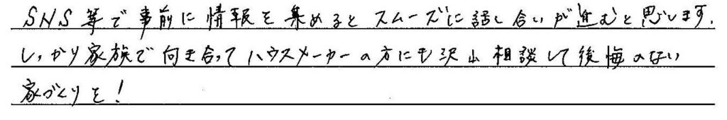 理想且つ後悔のない家を建てることができました。 熊本県上益城郡 / K様 Q 家づくりでどういうことを重視されましたか? A Q アーキハウスで建てようと思った決め手を教えてください。 A Q アーキハウスで家を建ててよかったと思うことはなんですか? A Q 家づくりを進めていくなかで、思い出に残ったことは何ですか? A Q 実際にお住まいになられていかがですか? A Q これから家づくりを始められる方に一言アドバイスをお願いします。 A