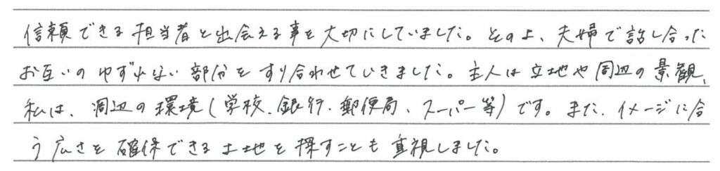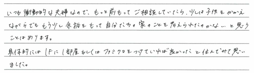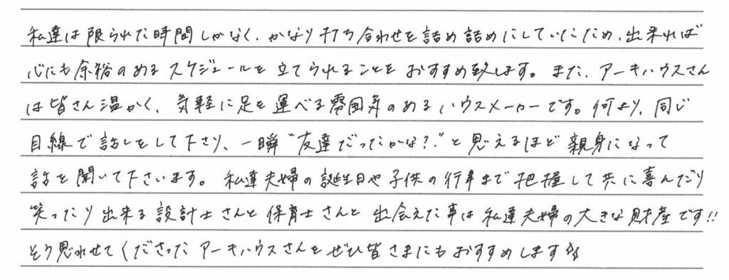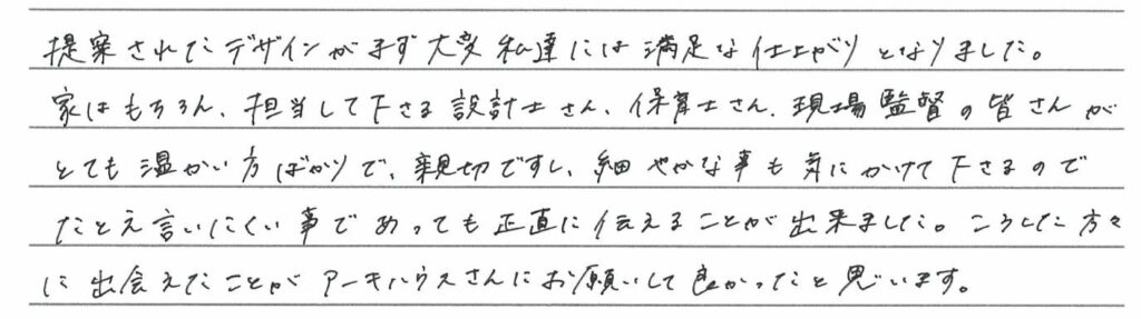 信頼できる担当者と出会える事を大切にしていました。 熊本県熊本市 / K様 Q どのようにして住宅メーカーや、設計事務所を探されましたか? A Q 家づくりでどういうことを重視されましたか? A Q アーキハウスで家を建ててよかったと思うことはなんですか? A Q ここをもっとこうしておけば・・・と思われることはありますか? A Q 家づくりを進めていくなかで、思い出に残ったことは何ですか? A Q これから家づくりを始められる方に一言アドバイスをお願いします。 A