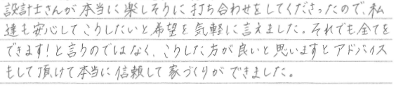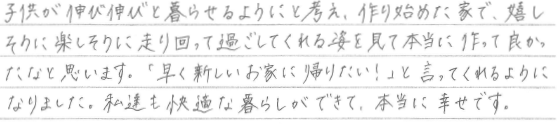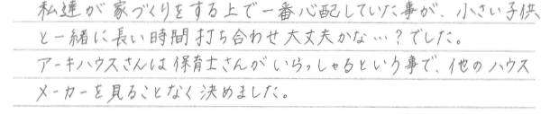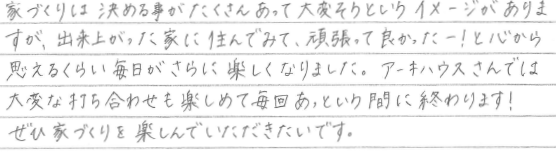 他のハウスメーカーを見ることなく決めました。 熊本県菊池郡菊陽町 / T様 Q 家づくりを始めたきっかけを教えてください。 A Q アーキハウスで建てようと思った決め手を教えてください。 A Q アーキハウスで家を建ててよかったと思うことはなんですか? A Q 家づくりを進めていくなかで、思い出に残ったことは何ですか? A Q 実際にお住まいになられていかがですか? A Q これから家づくりを始められる方に一言アドバイスをお願いします。 A