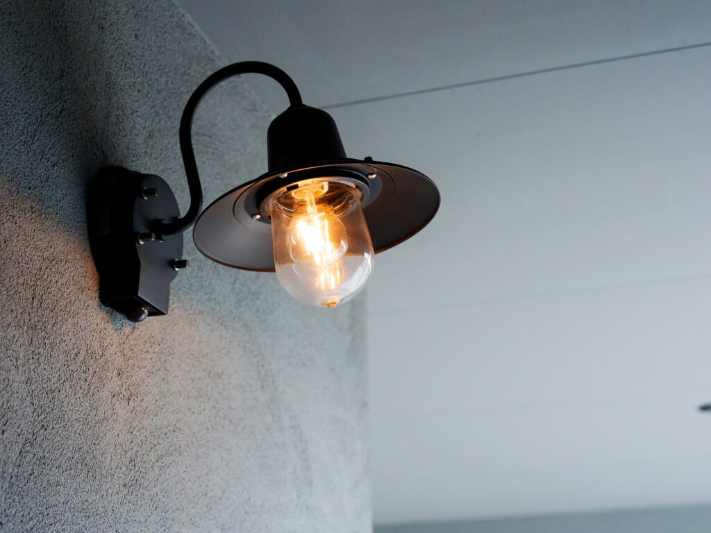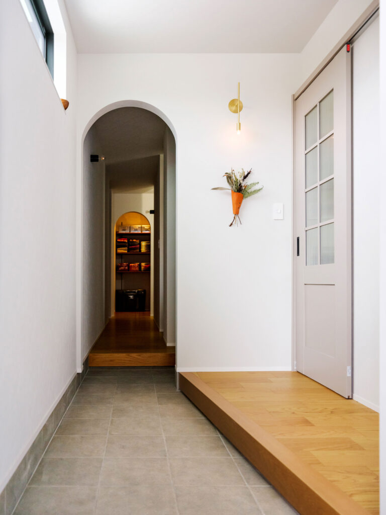 玄関の収納は見えない家族の動線上に。スッキリとした玄関に照明と格子付きのドアが可愛く映える。