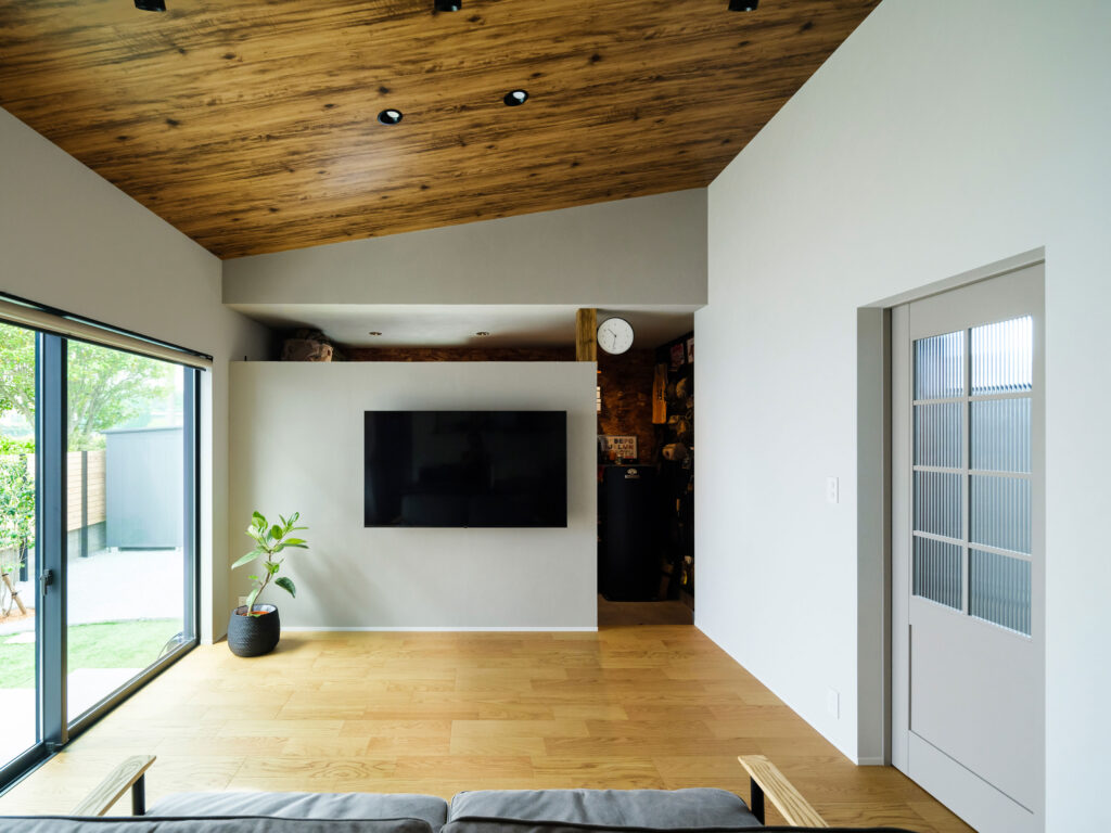 奥を見せ、箱をつくるようにくり抜かれた壁によって奥行を感じるリビングに。