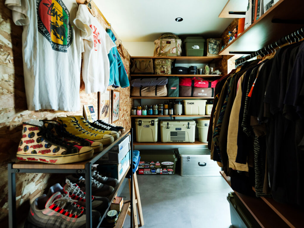 趣味のキャンプ道具や靴、古着が並ぶ心躍る土間収納。ビルトインガレージから直接荷物の出し入れが可能。