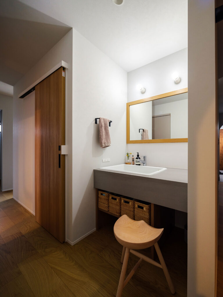 個室としてではなく、水まわりの動線にシンプルな造作の洗面台を配置。