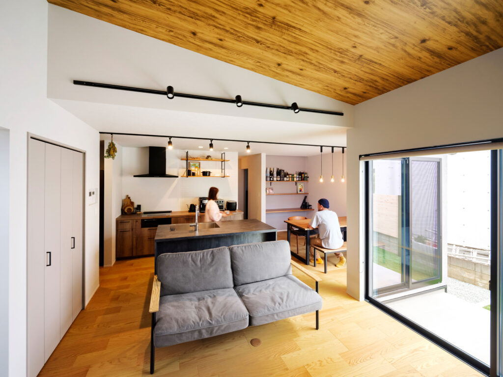 勾配天井が目を惹く開放的なリビング。キッチンは広い調理スペースと自由な動線が確保できるグラフテクトのⅡ型キッチンを採用。