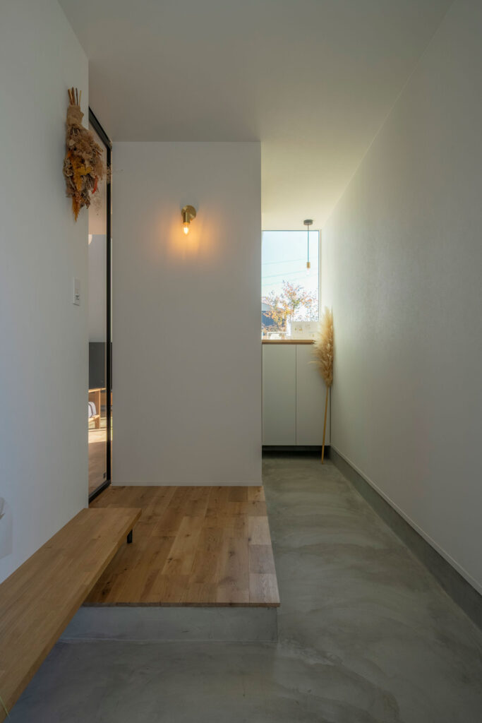 広々とした玄関土間。奥に配した窓が視線を外へと繋ぎ、空間に広がりと季節の彩りを添える。