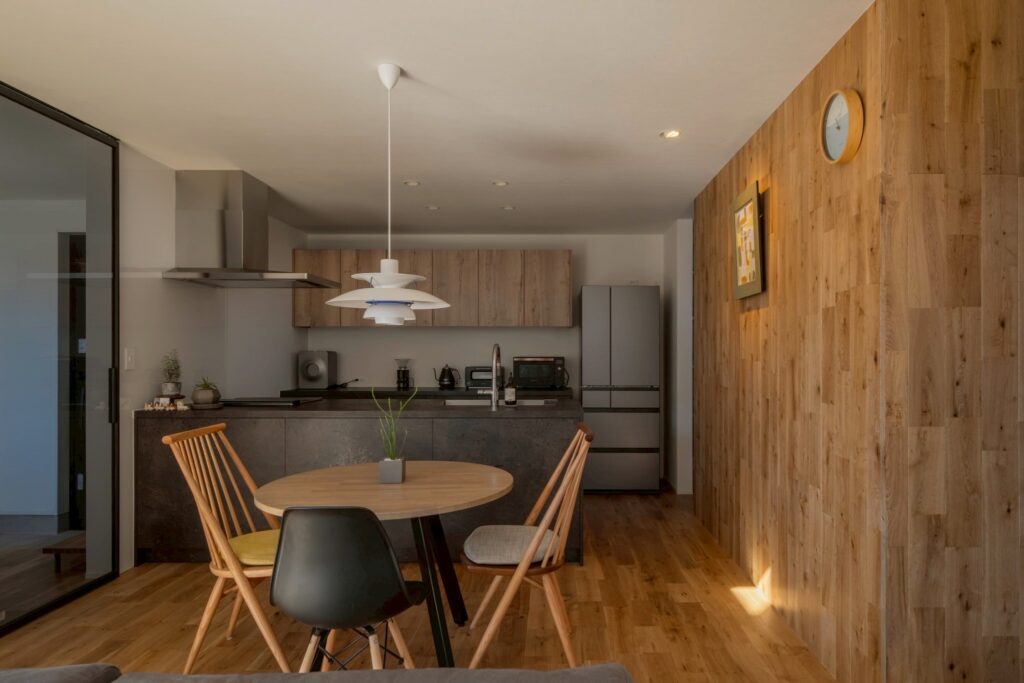 明るいリビングとは対照的な、シックで落ち着いたDK空間。壁には床材と同じオークの無垢材が立ち上がる。
