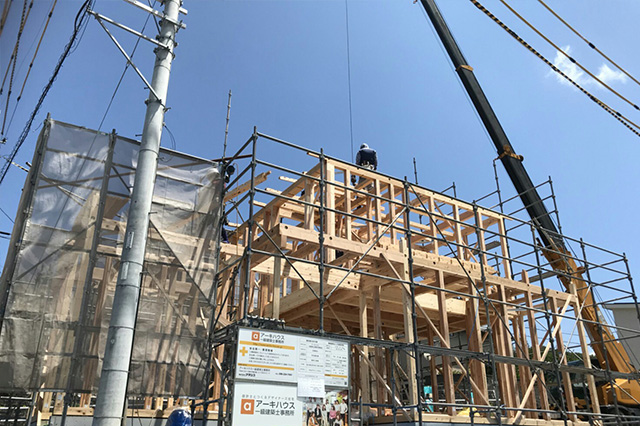 大安・友引などの吉日に上棟を行います。上棟とは、お家を建てるにあたり、柱や梁などを組み立ててから、屋根の一番上にある棟木を取り付けていくことを指します。家の骨組みを1日で組み立てていく圧巻の工程です。