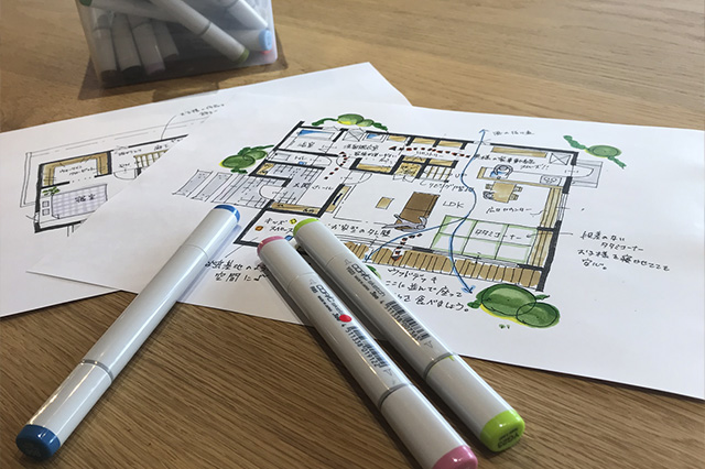 お客様のご予算とご要望をお聞きしながら理想のプランを一緒に考えていきます。設計士の目線で「土地の選び方」や「予算の配分」をお伝えし、その土地に最適なプランをつくっていきます。仮プランをベースにどんな暮らしをしたいか?お客様のご要望を加えながら、一緒にプランを考えていく時間です。