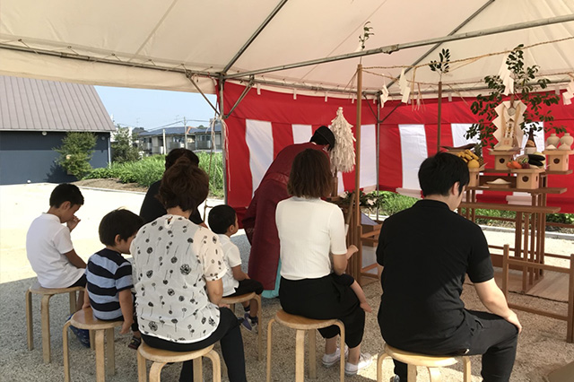 建築確認申請を経て、土地の神を祀ってご家族の安泰や工事の安全を祈願する地鎮祭を行います。敷地に地縄を張り、建物の配置などを確認していただきます。